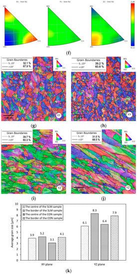 EBSD orientation image maps of the SLM + RS and CON + RS samples: (a) a border of the SLM + RS sample and (b) a centre of the SLM + RS sample in the XY plane (c) IPFs a border of the SLM + RS in the XY plane (d) a border of the SLM + RS sample and (e) a centre of the SLM + RS sample in the YZ plane (f) IPFs a border of the SLM + RS in the YZ plane (g) a border of the CON + RS sample and (h) a centre of the CON + RS sample in the XY plane (i) a border of the CON + RS sample and (j) a centre of the sample in the XY plane (k) a summary of all states of the average grain sizes in the XY and YZ planes.