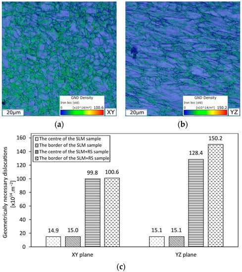 GND density corresponding with the SLM + RS sample (a) a border of the sample, the XY plane, (b) a border of the sample, the YZ plane, and (c) a summary of GND for the border and the centre of the SLM + RS sample in the XY and YZ plane.