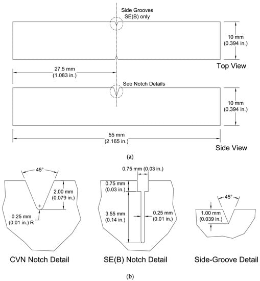 (a) Top and side views and (b) notch and side-groove details of CVN and SE(B) specimens.