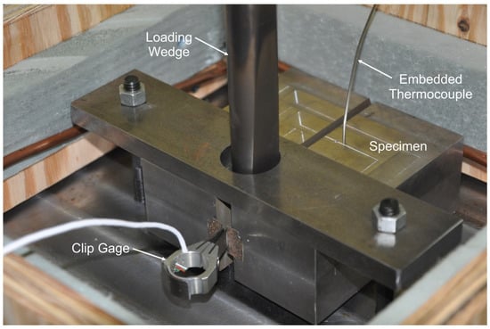 CMOD was measured using a clip gage similar to the previously described SE(B) fracture toughness testing. Load was applied under displacement control at a rate of approximately 8 mm/min (0.3 in/min) until reaching the maximum, δn,max, calculated using Equation (10):