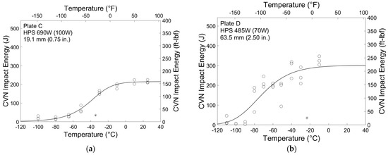 Typical CVN test results from Plates C and D are shown in Figure 6. These results are representative of the behavior of the HPS 690 W and 485 W (100 W and 70 W) plates, respectively. The only exception is that Plates A and J did not display well-defined upper and lower energy shelves at the temperatures tested. Testing at more extreme temperatures could have resulted in more typical behavior exhibited by the other six plates. However, the behavior of the steel at AASHTO minimum service temperatures was desired, so more extreme test temperatures were not used. The solid line in the plots is the five-parameter sigmoid curve given in Equation (1) graphically representing the different behavior regimes of the material. The curve was fit to the data using the least squares method. Also shown is the fracture critical minimum average energy requirement for each grade as per the AASHTO LRFD BDS [7], represented by an asterisk. For both grades tested, the minimum average energy is 48 J (35 ft-lbf). This requirement is applied at −34 °C (−30 °F) for HPS 690 W (100 W) and at −23 °C (−10 °F) for HPS 485 W (70 W).