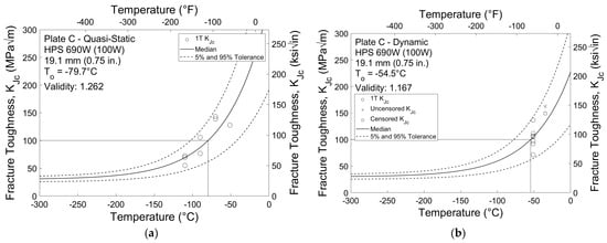 Similar to the results from the CVN impact tests, specimens sampled from the HPS 485 W (70 W) plates exhibit greater fracture toughness than those sampled from the HPS 690 W (100 W) plates. The average reference temperature for HPS 485 W (70 W) is approximately −162 °C (−260 °F) for quasi-static tests and −87 °C (−124 °F) for dynamic tests. This is significantly colder than the average reference temperatures for HPS 690 W (100 W) of −92 °C (−134 °F) for quasi-static tests and −55 °C (−68 °F) for dynamic tests. There is also a greater difference between reference temperatures obtained from the two stress intensity rates for the HPS 485 W (70 W) specimens. The average experimental temperature shift between quasi-static and dynamic reference temperatures for HPS 485 W (70 W) is 75 °C (135 °F), compared to 37 °C (67 °F) for HPS 690 W (100 W).
