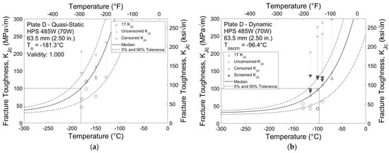 Fracture toughness test results that have been normalized to a 1T specimen thickness for Plates C and D are shown in Figure 7 and Figure 8, respectively. These results are typical for the HPS 690 W and 485 W (100 W and 70 W) plates, although the fracture toughness test results exhibit a slightly higher degree of variation than the impact test results. KJc values that are not crack growth or limit censored are represented by circles, while values that are crack growth or limit censored are represented by an X. For datasets that fail the homogeneity screening criterion shown in Equation (6), such as in Figure 8b, screening censored values are shown by a downwards triangle. In all cases, censored KJc values are represented by squares.