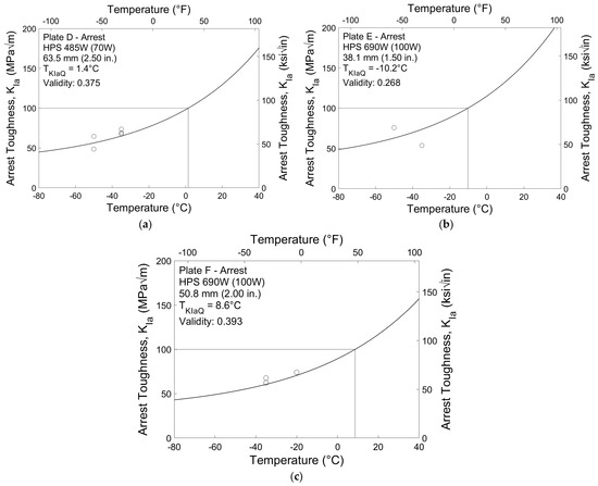 Valid crack arrest toughness results analyzed using the master curve methodology are shown in Figure 9. Unlike the tolerance bounds for fracture initiation toughness shown in Figure 7 and Figure 8, crack arrest toughness tolerance bounds are based on the scatter of the data rather than probabilistic flaw distribution. While there is little scatter in the valid results presented, there are insufficient data to constitute valid datasets and create tolerance bounds. As such, only the median curve is shown. Due to the relatively low degree of scatter in the results shown, the provisional arrest reference temperatures calculated for the three plates, TKIaQ, appear to be reasonable estimates despite having validity factors below 0.5. The reference temperatures range from −10 to 8.6 °C (14 to 47 °F), significantly warmer than the fracture toughness reference temperatures presented above.