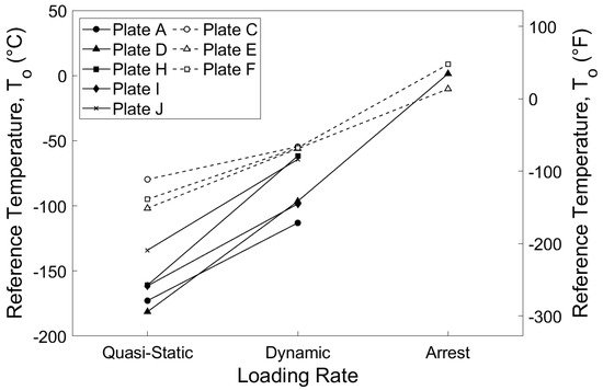 In total, four of the sixteen datasets were considered inhomogeneous: specimens tested at the dynamic rate sampled from Plates D and H and both specimens sampled from Plate I tested at both quasi-static and dynamic rates. Table 4 summarizes the reference temperatures calculated for each of the sixteen fracture toughness datasets. For the twelve homogeneous datasets, validity and To are reported, while the screened reference temperature To,scrn is reported for the four inhomogeneous datasets.
