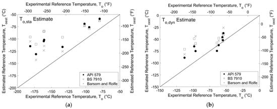 By comparison, the BS and API methods are direct predictions of static reference temperature, To,est. BS 7910 Method J.2.2 [5] utilizes the test temperatures that correspond to 27 and 40 J (20 and 30 ft-lbf), T27J and T40J, respectively, to estimate reference temperature through the application of Equations (15) and (16):