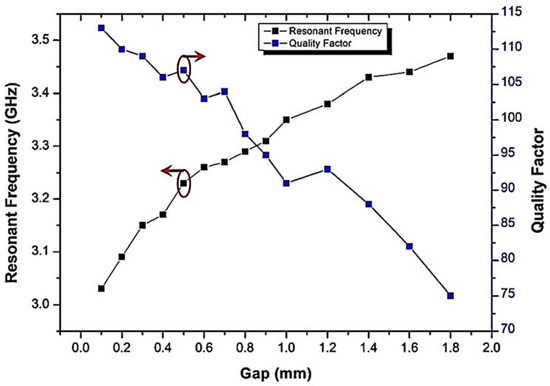 Another interesting parameter is the gap of the ring. The same analysis was applied to the ring gap by choosing an outer radius (R1) of 5.54 mm. It can be seen that an expansion in the ring gap leads to a high inductance value and causes a reduction in the Q-factor. As a result, the resonant frequency increases exponentially with the ring gap, as depicted in Figure 3. The Q-factor of the annular gap has a high value for the initial gap of 0.1 mm and then decreases. This shows that a small gap produces a high Q-factor. However, a high inductance must be created in the CSRR structure to generate strong electric fields between the gap and the slot of the ring. In addition, choosing a gap that is too narrow can lead to a manufacturing problem. Therefore, the dimension of the gap Rg = 0.5 mm with a Q-factor of 107 at 3.23 GHz is very suitable.