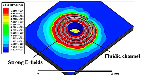 The principle of detecting changes in liquid MUT properties works through tube loading at the center of the sensor. Figure 4 describes the maximum exposure of the electric fields around the tube. There are one-shape elements at the feed line around the hole for electromagnetic excitation when the microfluidic channel is loaded at the center.