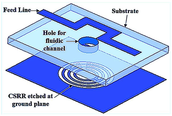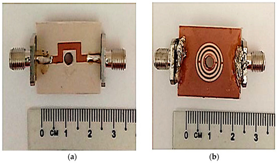 Microwave resonator sensors can be either passive or active devices with a single- or double-port network transmission line that relays the desired electromagnetic wave signal. It was found that planar microwave sensors with a microstrip split-ring resonator (SRR) and circular substrate-integrated waveguide topologies were capable of producing high Q-factors and sensitivities. The dielectric properties of the materials and the sensitivity of the resonator based on perturbation theory were measured accordingly. In addition, a wide range of resonators with different specifications were tested, including the resonant frequency, Q-factor, and bandwidth, and researchers were able to determine the material quantities and dielectric characterization of solid, semisolid, and liquid materials in real time. This provided a new, highly suitable method for determining dielectric properties in pharmaceutical, subsurface, chemical, biological, and biomedical applications [11,12,13,14]. Material characterization measurements are typically performed by analyzing the resonant frequencies of the sensors used to detect material properties. These resonant frequencies can be classified into two types: resonators, which are designed to oscillate at specific frequencies and are highly sensitive to changes in a material’s physical properties; and disturbances, which occur when a material exhibits significant changes in its mechanical behavior. According to previous studies [15,16], these two types of resonant frequencies can provide complementary information about a material’s microstructure and macroscopic properties, making them useful for a wide range of applications. Resonance methods can accurately describe material properties with a high sensitivity at specific resonant frequencies, in contrast to broadband techniques that provide information across a range of frequencies. Microwaves, insulating materials, and coaxial resonators are versatile tools that are widely used in materials science and engineering. They can be used to analyze the physical and chemical properties of materials in various settings, such as high temperatures, high pressures, or corrosive environments [17,18,19]. These resonators have been developed to meet the needs of industry as they are suitable for measuring materials and have a high accuracy. The various dielectric properties of substrates can be detected by a resonator in terms of its reflection and transmission coefficient characteristics [20,21,22]. However, attaining a good performance for microwave sensors in dielectric and fluid measurements for material detection is still a challenge. Conversely, these resonators could be more complicated in fabrication and have complex relative permittivity and permeability. Planar microwave sensors are used in this case due to their numerous features, such as having low costs, simple structures, and real-time characterization capabilities, as well as the ease of their fabrication [23,24,25,26].