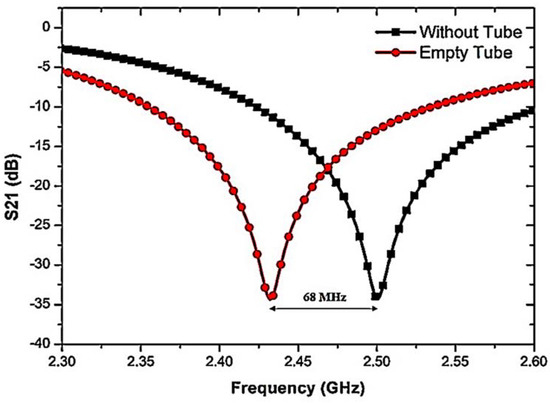 Another important analysis for characterizing liquid MUTs is the use of a polypropylene (PP) tube. Samples of dielectric material are filled into the channel of the PP tube and loaded into the CSRR center hole. The E-fields near the resonator affect the interaction with the liquid MUTs. Our observations were that the resonant frequency shifts slightly to a lower frequency of 2.432 GHz with a shift of 68 MHz when the empty tube is loaded (see Figure 6).