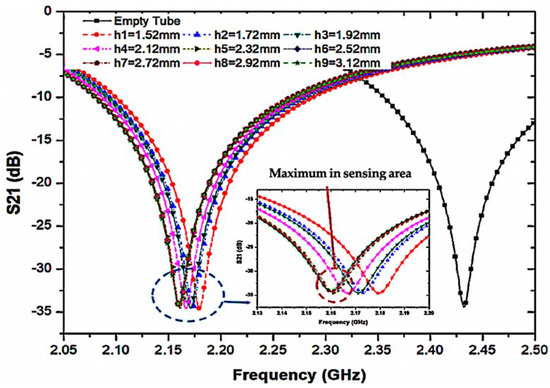 The simulated transmission coefficient (S21) of the suggested sensor with the empty and distilled water (DI water) loaded into a 6 mm tube as indicated in Figure 8, where the optimal volume length is 2.52 mm, equivalent to 7.92 μL of liquid.