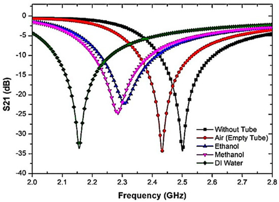 To further study the response of the sensor to the TR CSRR sensor, different fluid types with different dielectric characteristics and relaxation periods were used. Each sample has dielectric properties that perturb the electric fields in the sensor region and are ultimately described as a response to the characterization of the properties. Figure 9 shows that due to the polar properties of the samples, the resonant frequency and insertion loss were obviously changed.