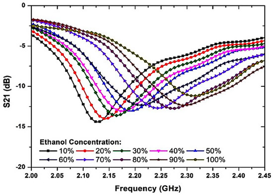 The suggested sensor’s lower detection limit is 10% ethanol. To develop 10% ethanol, 0.2 mL of DI water was combined with 1.8 mL of 100% ethanol. The absolute ethanol solvent (C2H6O, part number 19,535) was manufactured by Chemiz (M) Sdn. Bhd., Malaysia. The resonance frequency was reduced from 2.312 GHz to 2.112 GHz, as the ethanol concentration increased from 0% to 100%. It was observed that the proposed sensor showed a 200 MHz frequency shift for the ethanol concentration, which is better than that of the proposed references [55,56,57]. The results showed a distinguishable frequency response when the ethanol concentration was changed. Specific mixture proportions shift the frequency and amplitude signals relative to each other. The main reason for this shift was the high-loss liquid, which causes more perturbation in the radiated near field than a lower-loss fluid, and therefore, a lower resonant frequency.