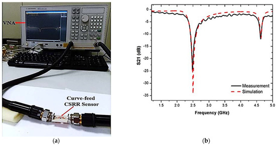 (a) Testing setup, and (b) predicated and measured outcomes of the TR CSRR sensor.