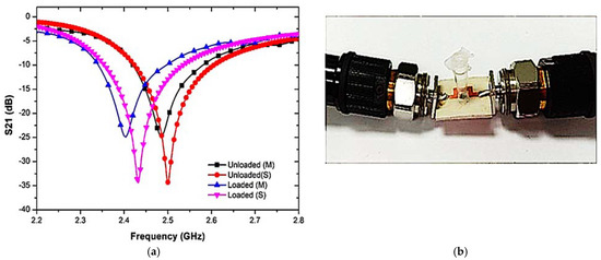 The disturbance parameters of the loaded transmission line are measured with a vector network analyzer. The response of the sensor is evaluated and recorded during the experiment when it is filled with liquid MUTs. A PP tube was incorporated into the TR CSRR sensor to evaluate the dielectric properties of the liquid samples. The experimental setup of the proposed sensor with the results of the S-parameters for the simulated and measured frequency responses is demonstrated in Figure 12.