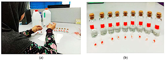 Ethanol–distilled water solutions’ preparation: (a) Fill the solution into a PP tube; (b) Ratio of the ethanol–distilled water mixture.