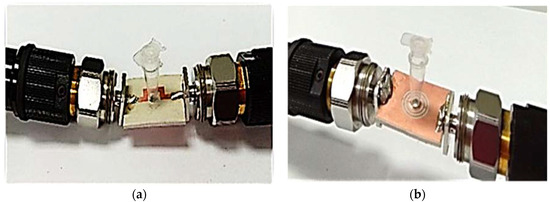 The fabrication of the TR CSRR sensor was performed using Rogers RT Duroid 6002 substrates with a geometric width of 20 mm × 25 mm × 1.52 mm by standard photolithography and the PCB etching process. The image of the fabricated sensor is displayed in Figure 11 and its substrate has a relative permittivity 𝜀′ of 2.94 and a loss tangent 𝑡𝑎𝑛 𝛿 of 0.0012. Nevertheless, the termination between the radial 50 ohm flange connector SMA and the PCB is not good grounding, resulting in a high tolerance. Thus, it is suggested that in the future, the connector type RF with the straight 50 ohm flange attachment SMA would provide better grounding and data with minimal tolerance.