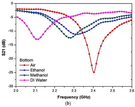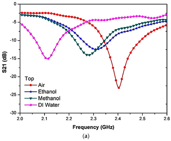 The resonant frequency was also measured in the presence and absence of liquid MUTs. Each sample has dielectric effects that interact with the electric fields in the sensor region and are eventually clarified as a response to the characterization of the properties. Figure 9 shows that the resonant frequency and insertion loss were significantly changed due to the polar properties of the samples.