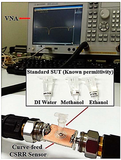 The liquid MUTs are discussed and demonstrated in this subsection. The designed TR CSRR sensor is etched at the ground plane with a curve U-shaped feed line to drop strong electromagnetic excitation around the hole, as shown in Figure 5. In order to prove the concept of our design, numerous drop tests were conducted by testing the influence of the liquid MUT on the sensors’ transmission properties.