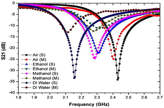 The simulation results are examined by a synthesis analysis and optimization to obtain optimal results. A comparison between the simulation and measurement results is also discussed. The study focuses on the repeatability of the details of the MUTs, complex permittivity, sensitivity, and the ethanol concentration in the MUTs samples. Other common solvents are measured (distilled water, ethanol, and methanol) to demonstrate the sensor efficiency from 1 to 5 GHz using an Agilent VNA (see Figure 17). To properly test the dielectric properties, 7.92 μL of each is required for the measurement.