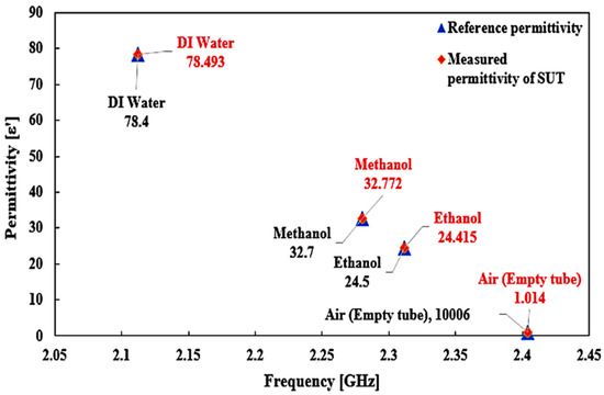 Comparison of the ideal and measured real–part permittivity of several liquid MUTs.