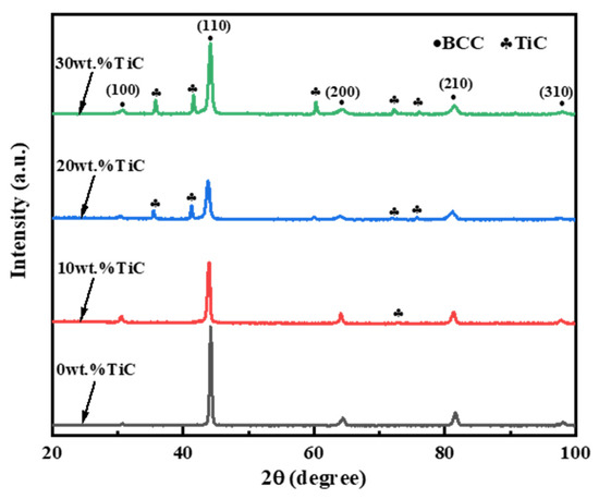 Figure 1 shows the XRD diffraction patterns in the Al1.8CrCuFeNi2 HEA-based coatings with different TiC contents. The results showed that a single solid solution of BCC was formed in the Al1.8CrCuFeNi2 HEA, which was consistent with previous research [15]. After adding 10 wt.% TiC, the phase structure of the coating was still the single BCC phase. No obvious peaks in the TiC phase diffraction were found, which was similar to the report in [19]. In addition, the diffraction peak was slender, indicating that the crystal crystallinity was high and the grain size was large [21]. When 20 wt.% TiC was added, the half-height width of the BCC phase diffraction peak increased significantly. The results indicated that the crystallinity and grain size of the coating decreased. The main reason was that after too much TiC was added to the grains in the crystal, the TiC was dispersed in the coating, which hindered the movement of the grain boundaries and inhibited the growth of the grains. In addition, when the content of TiC was increased to 20 wt.%, some new diffraction peaks corresponding to the TiC compound appeared in the XRD diffraction pattern. The reason was that with the increase in the TiC content, the TiC in the grain was gradually saturated, and a large number of TiC-agglomerated particles were formed. When the TiC content increased to 30 wt.%, the height of the diffraction peak in the BCC structure increased, but the half-height width did not obviously narrow. Therefore, according to the Scherrer formula, the grain size in the BCC phase did not change significantly, but the content in the BCC phase increased [22].