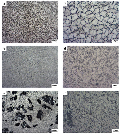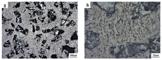 Metallographic structure of high-entropy alloys with different TiC contents: (a,b) 0 wt.%; (c,d) 10 wt.% TiC; (e,f) 20 wt.% TiC; (g,h) 30 wt.% TiC.