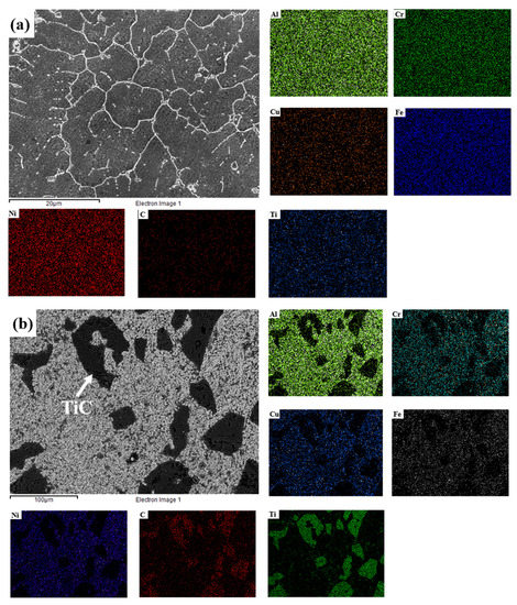 TiC was selected as the strengthening phase due to its extremely high hardness (above 3000 HV) and low density (4.93 g/cm3). Its excellent microstructure makes it a high-quality nucleation core in the alloy system to promote grain refinement. Moreover, the high hardness and high melting point of TiC particles enable them to be pinned between grains, which plays the role of second-phase strengthening and greatly improves the hardness and wear resistance of the material [20].