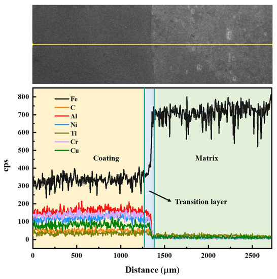 Figure 4 shows the longitudinal section morphology and element distribution of the matrix, transition layer and coating with 10 wt.% TiC. The three regions are clearly defined in the figure. The element distribution was analyzed from the substrate to the coating. From the matrix to the transition layer, the elements showed an obvious diffusion trend, which indicated that the formation of the molten pool enabled the movement and diffusion of each element atom during the cladding process, and the heat provided the kinetic energy for the atom movement. Therefore, the element bonding state was excellent, and could maintain perfect metallurgical bonding. In addition, Ti and C were uniformly dispersed in the coating, which increased the overall hardness of the coating.