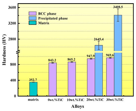 Figure 5 shows the hardness of the matrix and composite coatings with different TiC contents. The results showed that the hardness of the high-entropy alloy coating was greatly improved compared with the matrix. Moreover, with the increase in the TiC content, the hardness of the BCC phase and the TiC-agglomerated particles in the composite coating increased continuously.