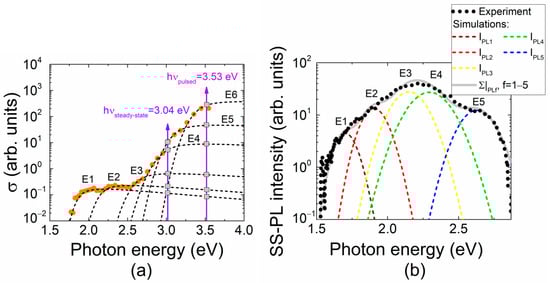 Figure 1a shows the σd(hν) spectrum illustrating αd(hν) with normalized nd distribution inherent for MOCVD GaN materials. It can be deduced from Figure 1 that excess carriers excited by UV laser are capable of inducing photo-luminescence from all the traps (highlighted as the spectral steps) including exciton annihilation, followed by phonon replicas, while the laser diode radiation at 408 nm wavelength affords ionization of the centers with activation energy less than that of the E5 trap. The origin of traps, tentatively identified by coinciding peak values of activation energy referenced in literature, is denoted in Table 1.