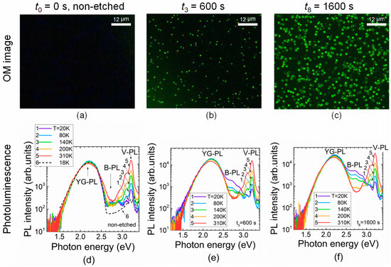 (a–c) Evolution of optical microscopy (OM) images dependent on etching exposure. (d–f) PL spectra measured at different sample temperatures and dependent on etching exposure duration (t) when an H3PO4 temperature of 150 °C was kept over etching procedures. A sketch (curve 6) of the PL spectrum typical for the MOCVD grown GaN is taken from Ref. [43] and plotted in Figure (d) as a dashed curve for comparison of inherent spectral structures.