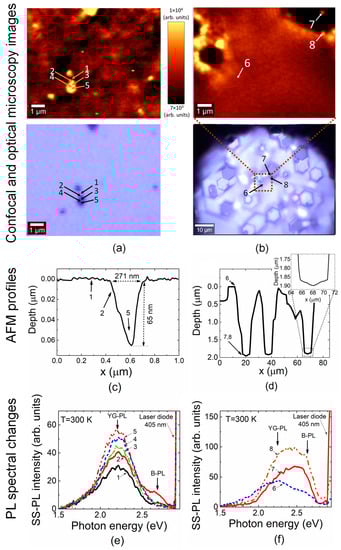 Correlation among confocal microscopy (of PL integrated within 450 to 720 nm spectral range) and optical microscopy images (a,b), as well as atomic force microscopy (AFM) profiles (c,d) and PL spectral variations (e,f). The numbered localized etch-pits (a) and the intersection of etched areas (b) obtained with enhanced spatial resolution are illustrated in top figures (a,b). The related optical images (bottom figures (a,b)) obtained in reflected light on the examined sample areas. The atomic force microscopy profiles scanned close to a single etch-pit (c) highlighted after short etching exposure; and rather extended areas (d) of the intersecting etched surfaces, formed under long etching procedures. The shape of the dislocation-ascribed single etch-pit can be employed for identification of dislocation type (as the edge dislocation ascribed etch pit illustrated in (c)). The deep etch-pits ascribed to either screw- or mixed type dislocations can be assumed by analyzing intersections of wide area etched hexagon valleys (d). The blue PL band spectral components appear only (e,f) when the confocal microscopy probe is localized either close to the core (location 2 in (a,c,e)—assuming dimensions of space charge region R0) of the single dislocation or steep planes of hexagonal valleys ((b,d,e), respectively). Numbers (1–8) denote locations nearby etch-pits where the PL spectra are recorded.