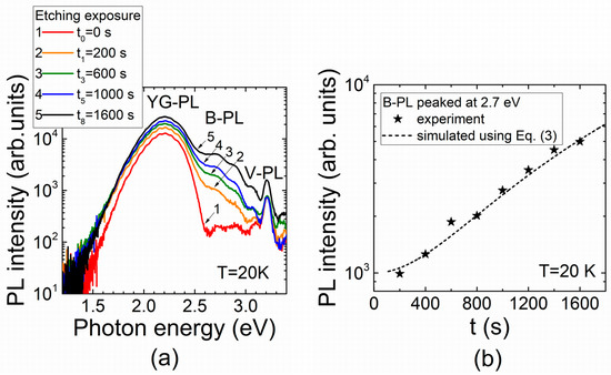Variations in the PL spectral structure and the B-PL peak intensity dependent on etching exposure are illustrated in Figure 4. The IB-PL dependence on etching exposure, simulated using approximation Equation (3), is compared in Figure 4b with that measured at T = 20 K. This dependence indicates a nearly quadratic increase in the peak intensity after primary sessions of etching despite a later trend toward saturation appearing when the etched terrace area stabilizes.