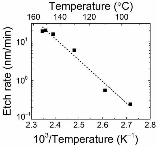 It can be deduced from Figure 5 that fast removal of GaN material is achieved at elevated temperatures of 160 °C close to the boiling temperature of H3PO4, while a nearly exponential decrease in etching rate appears with the reduction in the acid temperature.
