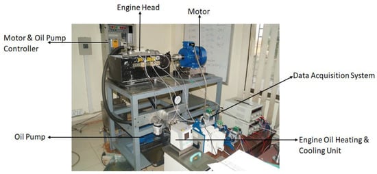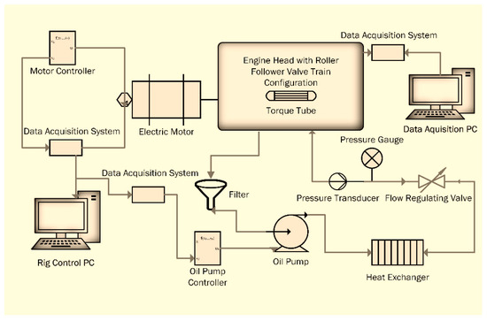 A flexible engine test bench (Figure 3) was developed for the tests, and the schematic of the test bench is shown in Figure 4. It comprised two electric motors, an oil pump, oil heating/cooling system, motor controllers and an optical encoder. The cylinder head was bolted securely onto the test plate, which was then attached to a rig stand in order to minimize vibrations. The camshaft was driven with a 5.5 kW, 3-phase induction motor. The camshaft was connected to the motor with the help of an axial plug-in type steel bellows coupling. The purpose of using this specific coupling was to transmit the torque without any backlash and to provide compensation for radial, angular and axial misalignments. The speed of the camshaft could be varied up to 3000 rpm and was controlled through a microprocessor-based programmable AC motor controller. The controller was set up in a closed-loop vector mode feedback mechanism through an encoder so that 100% standstill torque could be provided. A high resolution 760 series pull-up type British optical encoder that provided 720 incremental pulses per revolution was mounted at end of the electric motor. The encoder was used in the determination of the cam–crank angle and acted as an external clock for the data acquisition system so that the instantaneous friction torque reading could be synchronized with the camshaft angle. The top of cam lift was determined using a dial indicator with an accuracy of ±0.4°. The index pulse of the optical encoder was synchronized to appear at the cam’s nose. The incremental pulses of the encoder were used as an external trigger to acquire the signal from the strain gauges at every 0.5°, providing 720 readings in one complete rotation. The index pulse was read separately as an analog input. For oil circulation through the engine, a 180-bar oil pump was used. The pump was driven by a 1.5 kW electric motor. Temperature of the oil was controlled with the help of an in-line plate type heat exchanger, which was connected to an external heating and refrigerant circulation unit. A Piezo-resistive pressure sensor was used to measure the oil pressure, whereas a k-type thermocouple was attached at the oil inlet of the engine head gallery for measuring the oil temperature. In order to prevent heat loss, all of the oil-circulating pipes were properly insulated.