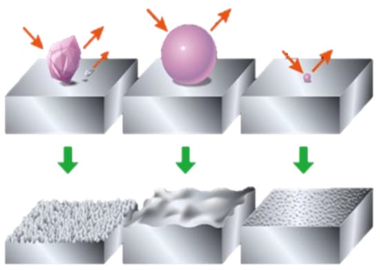 The WPC (Wonder Process Craft) surface treatment method has been used for a number of years in Japan. Limited details are available about the WPC process, which has over 40 patents [33,34]. The WPC surface treatment process is analogous to shot peening. As represented in Figure 1a, WPC treatment is a technology that involves a jet of particles mixed into a compressed gas, which is bombarded onto a metallic surface at high speed [35]. Fuji Kihan Co., Ltd., Tokyo, Japan, developed a surface treatment procedure in which the effects of forging and heat treatment were attained by injecting particles within a duration of tens of seconds to a time span of several minutes at high speeds, having a diameter of 50 microns, 1/3000 size in volume in comparison to those used in conventional shot peening methods, which involve the use of particles of around 600–800 mm in diameter [33,34,35]; a comparison between the particle size has been shown in Figure 1b.