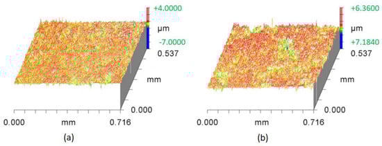 Three-dimensional surface optical profilometry plots: (a) original untreated roller; (b) WPC-treated roller.