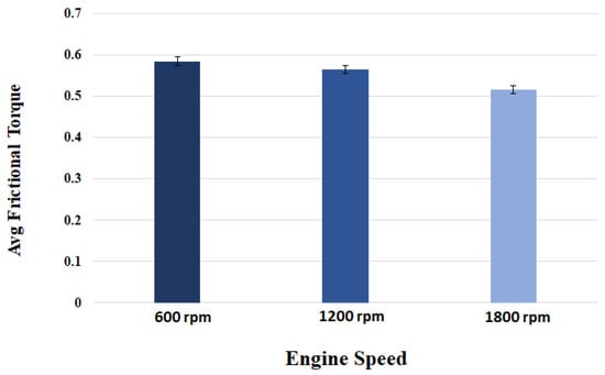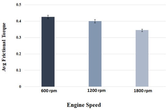 However, at a lubricant inlet temperature of 95 °C with the same increment in the speed, the frictional losses reduced by 12%, as shown in Figure 18c. A similar situation was also found for the WPC-treated roller, where the frictional losses were reduced by 8% and 10% at 25 °C and 95 °C, respectively, once the camshaft speed was increased from 600 rpm to 1800 rpm. The reason for this is that at higher frequencies, the lubrication conditions improve significantly at the cam–roller interface due to a decrease in contact load at the cam’s nose area [48] and a substantial increase in the quantity of lubricant entrained [17,18,19,32,46,47]. However, at reduced frequencies, the contact load at the cam’s nose is greatly affected by the compression of the valve spring, which causes higher friction around the cam’s nose region. This effect weakens at higher camshaft speed because of the inertial effects on the spring of the valve.
