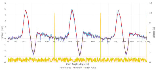 The data acquired from the torque transducers depicted a characteristic waveform. Since all the tests were performed under motored conditions, the shape of the waveform remained constant, which exhibited high repeatability of the installed transducers. The instantaneous torque typically comprises frictional (which is a function of tribological performance) and geometrical torque components.