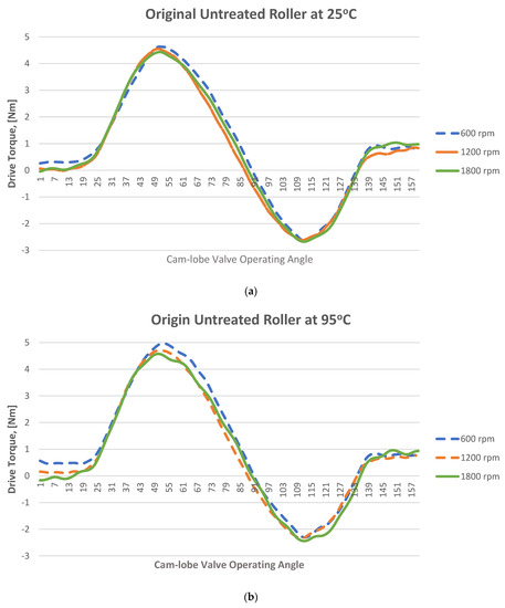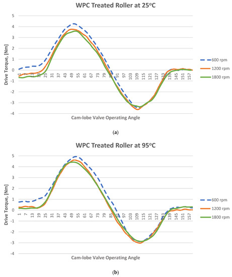 The magnitude of measured frictional torque at the cam–roller interface under different camshaft speeds and oil inlet temperatures for both the original untreated roller and for the WPC-treated roller is displayed in Figure 18. The presented data is an average of ten complete engine cycles. It can also be observed clearly that the frictional losses of the WPC-treated roller are considerably less in comparison to the original untreated roller, as shown in Figure 18. At a lubricant inlet temperature of 25 °C and at cam speed of 600 rpm, the difference in frictional losses between the original and WPC-treated rollers is 28% (the friction torque is 0.43 Nm for the original roller and WPC-treated roller is 0.30 Nm). However, at a higher lubricant inlet temperature of 95 °C while operating on the same engine speed, the difference in frictional losses between the original and WPC-treated roller reduced by up to 19% (the friction torque is 0.59 Nm for the original untreated roller and for the WPC-treated roller it is 0.47 Nm). The reason for the reduction in friction for the WPC roller is attributed to the surface treatment, which relatively increased the micro-surface roughness of the roller by forming fine micro-sized dimpled surface, which helped retain the oil film on the roller’s surface. This retention of oil on the roller surface reduced the direct contact between the cam and roller, resulting in reduced friction.