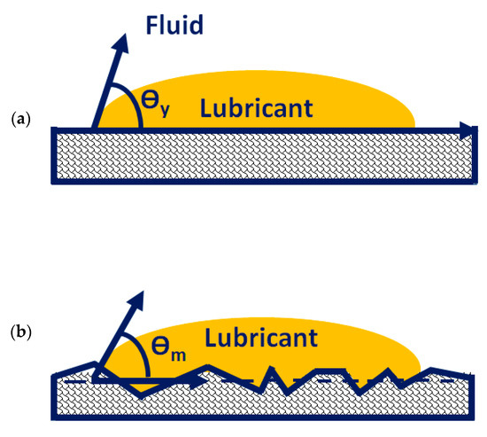 According to the Wenzel relation [42], increasing the surface roughness to a certain extent enhances the ability of the liquids to retain their contact with the surface (increase wettability). The WPC treatment process increases the surface roughness of the rollers by forming a fine micro-dimpled surface. This is one of the main reasons for the reduction in frictional losses. Due to the dimpled surface, an oil film is retained on the surface of the roller, which reduces the direct contact between cam and roller, and as a result, friction is reduced. The film’s retention is maximum at lower temperatures and weakens with the increase in temperature because at high temperatures the surface energy reduces, and as a result the bonding between the roller’s surface and the liquid film diminishes. As the surface roughness increases, the disruption of intermolecular bonds also increases, which leads to elevated surface energies. Because of the high surface energy, the surface tends to bond with the liquid molecules in order to minimize the energy, and liquids consequently achieve the complete wetting of surfaces. The increase in surface roughness also reduces the contact angle, i.e., the angle between the tangent to the liquid–vapor interface and the line that represents the apparent solid surface, Figure 17. This reduction in contact angle also increases surface wettability.