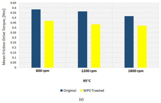 The effects of oil inlet temperature on the frictional torque at the cam–roller contact are realized in Figure 18. At a low camshaft operating speed of 600 rpm, the frictional torque increased by 27%—as shown in Figure 18a—once the temperature was increased from 25 °C to 95 °C, whereas the rise in friction reached up to 33% at a relatively high-speed of 1800 rpm as in Figure 18c. A similar trend of increase in frictional torque with rise in oil inlet temperature was also observed for the WPC-treated roller as shown in Figure 18. The reason for this is attributed to the fact that an increase in temperature reduces the oil’s viscosity considerably. The lubrication mode is pushed more towards the mixed and boundary regimes, increasing the tendency of asperity interactions, causing increase in friction at the cam–roller interface [17,18,19,32,46,47]. The experimental data shows a reduction in engine drive torque when using WPC-treated rollers in comparison to untreated/original rollers in any given testing condition. One of the main reasons for the reduction in drive torque of the WPC-treated rollers in comparison to the original untreated rollers is the increase in surface roughness by the WPC process; this increased average surface roughness has been known to help in lubricant film retention, which results in improved traction and also a reduction in roller slippage [32]. Traction is most probably improved by an increase in average surface roughness of the WPC-treated parts, which results in the prevention of slippage at the cam–roller interface and in turn reduces the drive torque. In addition to the phenomenon of increased lubricant retention obtained through the application of WPC-treatment, there are multiple other benefits of applying this process of mating metallic machine components and parts. The WPC process is protected by over 40 patents [34,39]; thus, limited information is available regarding the exact process. The process is known to provide multiple advantages, including strengthening of the metallic surface through thermal treatment and forging effects. Transformation into martensite of the austenite retained in the metallic surface layer is performed via WPC, resulting in a recrystallized, dense, high-toughness and high hardness surface [40], which not only reduces roller slippage [32] but also results in a reduction in drive frictional torque.