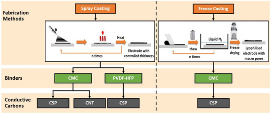 Spray coating and freeze casting (or lyophilisation) were chosen as the two scalable methods for making thick electrodes with a controllable structure. The knife casting method was not considered due to the formation of cracks in the thicker coatings upon drying. Figure 1 depicts a schematic of the electrode preparation processes by spray coating and freeze casting.