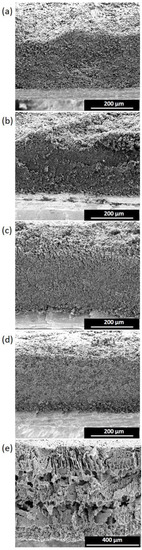 SEM images of thick electrodes (a) 4_CSP_5%CMC, (b) 4_CNT_5%CMC, (c) 4_CSP_10%PVDF-HFP, (d) 4_CSP_15%PVDF-HFP, (e) 3A_LYO_5%CMC.