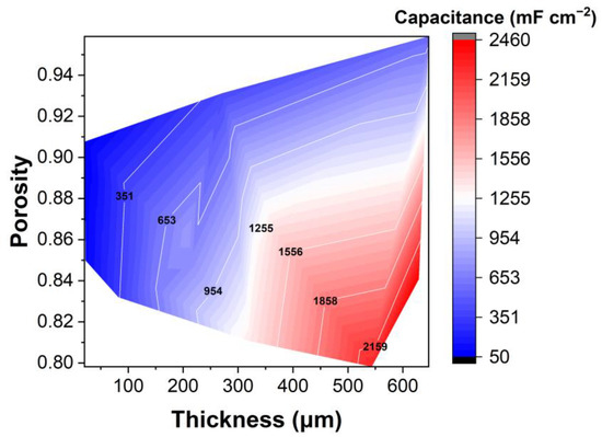 Dependence of electrode areal capacitance (at 10 mV s−1) on thickness and porosity (10 mV s−1).