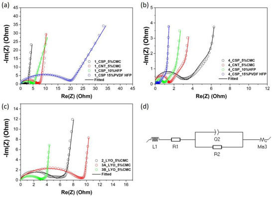 EIS fitting for (a) thin electrodes, (b) thick electrodes and (c) freeze-casted electrodes and (d) equivalent circuit.