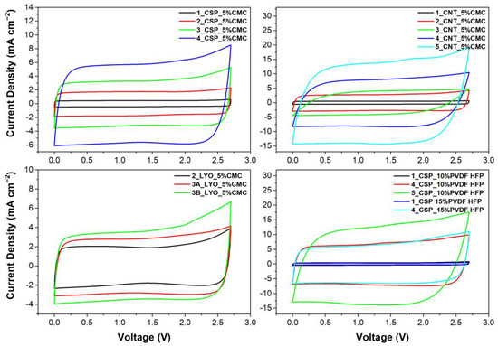 Figure 6 shows the CP curves of different electrodes with increasing thicknesses at a scan rate of 10 mV s−1. The graphs show that as the thickness of electrodes increases, the area under the graph also increases, signifying and increase in areal capacitance. Comparing methods, it is noted that the freeze-casted electrodes had significantly lower capacitance compared to the spray-coated electrodes; however, the freeze-casted and pressed electrode (3B_LYO_5%CMC) showed a better areal capacitance and rate capability than its unpressed counterpart (3A_LYO_5%CMC), revealing that while the macro pore structure allows better electrolyte percolation, it reduces the contact between carbon particles, leading to poor electron transfer.