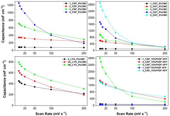 The role of binder in the capacitance of electrodes can also be assessed from Figure 7. CNT-based electrodes had slightly better areal and volumetric capacitance than CSP-based electrodes, as they are known to disperse better with CMC. Interestingly, while the overall areal capacitance of CNT electrodes was higher than that of CSP, the slope of capacitance vs. scan rate was also higher. That is, CSP-based electrodes demonstrated a lower reduction in performance as the scan rate increased. Moreover, despite the better bonding and better mechanical strength of CNT electrodes, CSP-based electrodes of similar thickness had better gravimetric capacitance (Figure S1). Therefore, carbon-to-carbon contact in thick electrodes is better with CSP, although the thickness cannot be increased over a certain limit due to the development of cracks, unlike CNT-based electrodes.