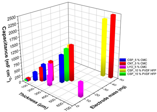 The use of carboxymethylcellulose (CMC) as binder with CNTs as conductive additives led to electrodes with good mechanical strength but, not especially flexible, whereas thick electrodes developed using PVDF-HFP copolymer as the binder not only had high mechanical strength but were also flexible. Nevertheless, these latter electrodes required a higher percentage of the binder, which increased the percentage of non-active components in the supercapacitor. Moreover, since the areal capacitance of the CMC and PVDF-HFP thick electrodes was similar, CMC with CNTs was judged to be a better option to develop thick electrodes, since CMC is environmentally friendly, soluble in water, and is required in lower quantities.